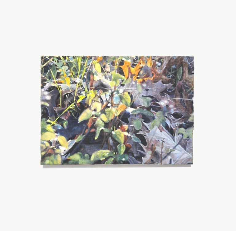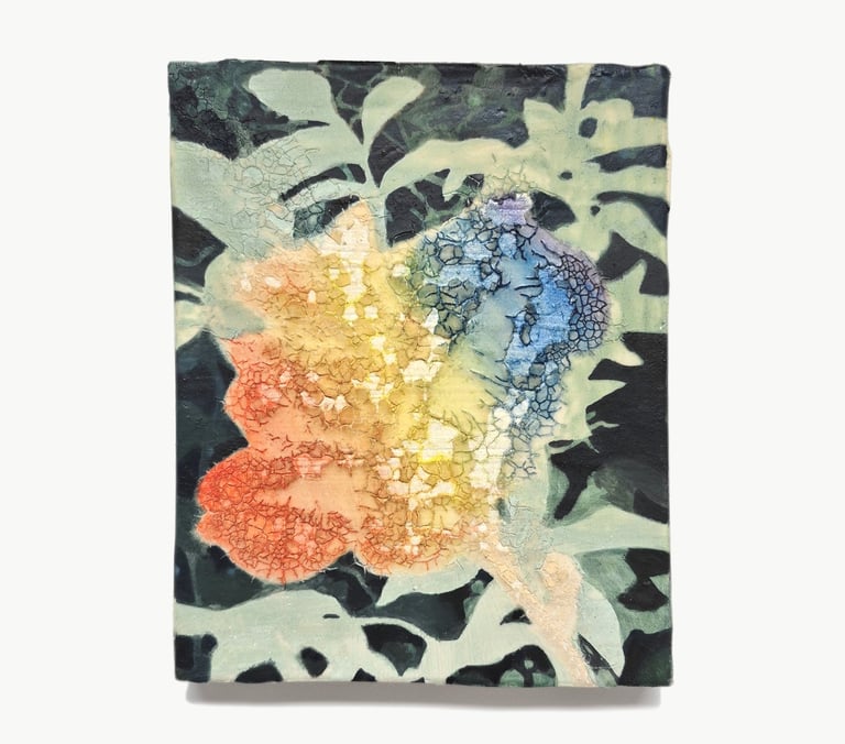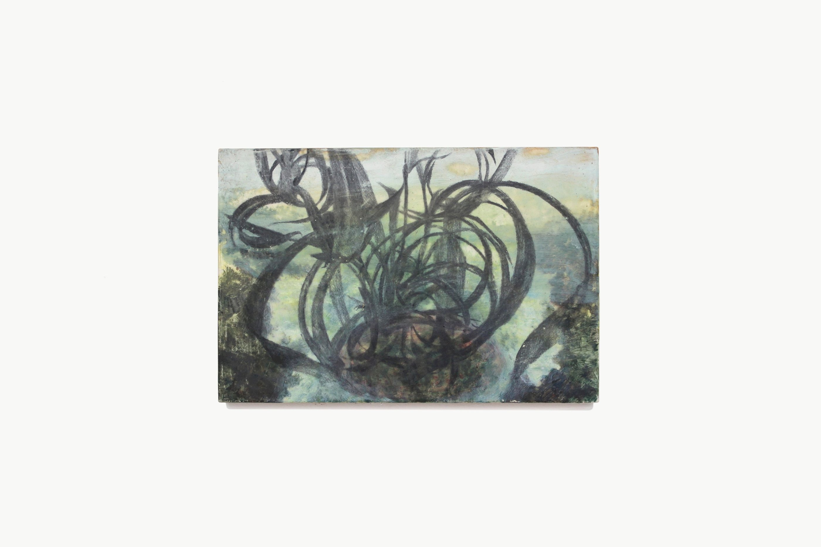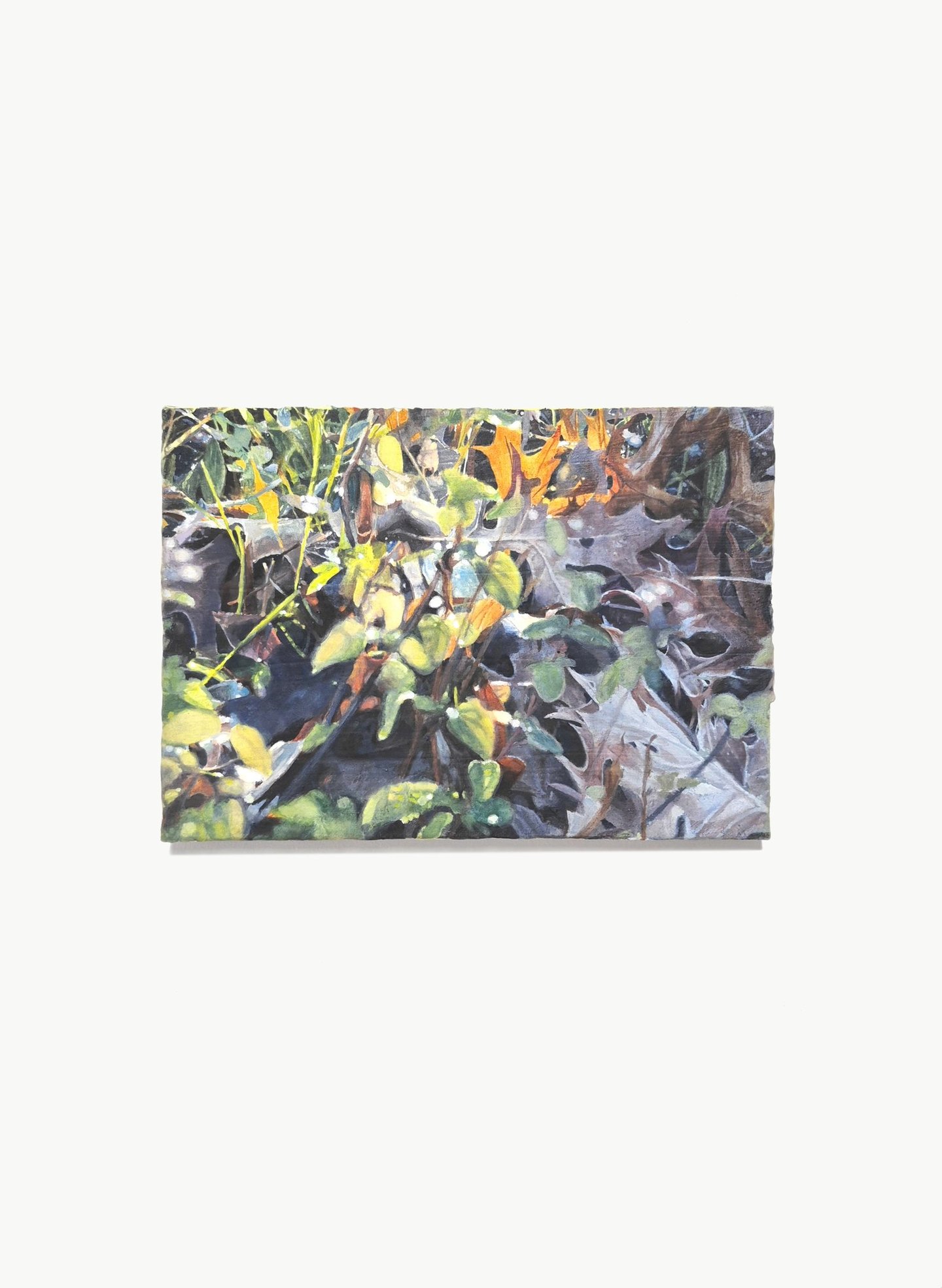 2023. 24 x 16 cm, huile, gouache, végétaux, vernis et papier sur toile