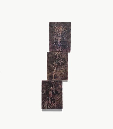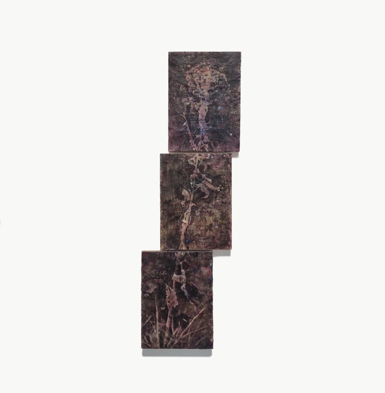 2025. 120 x 43 cm, triptyque, encaustique, huile et végétaux sur bois